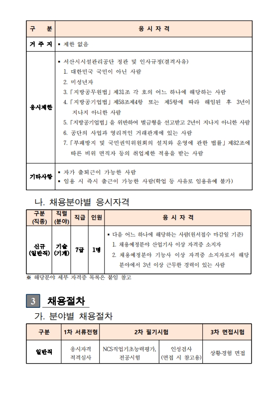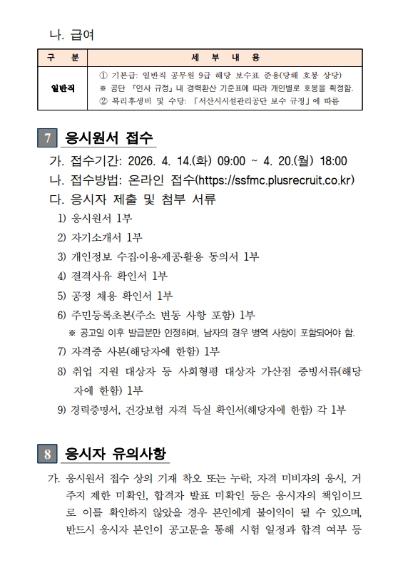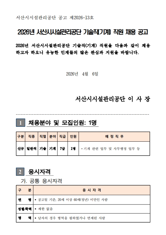 [채용] 2026년 서산시시설관리공단 기술직(기계) 직원 채용 (~ 4. 20. 월)