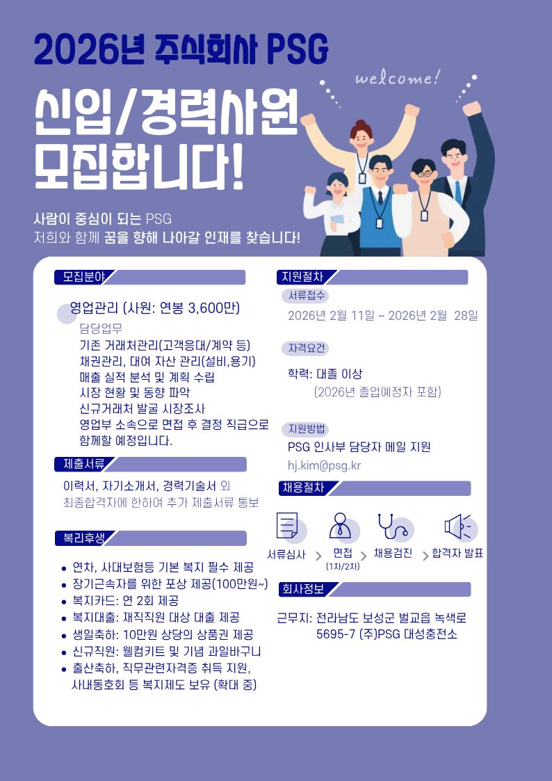 이번에 전남 보성에 위치한 (주)PSG 대성충전소 영업관리 채용 공고를