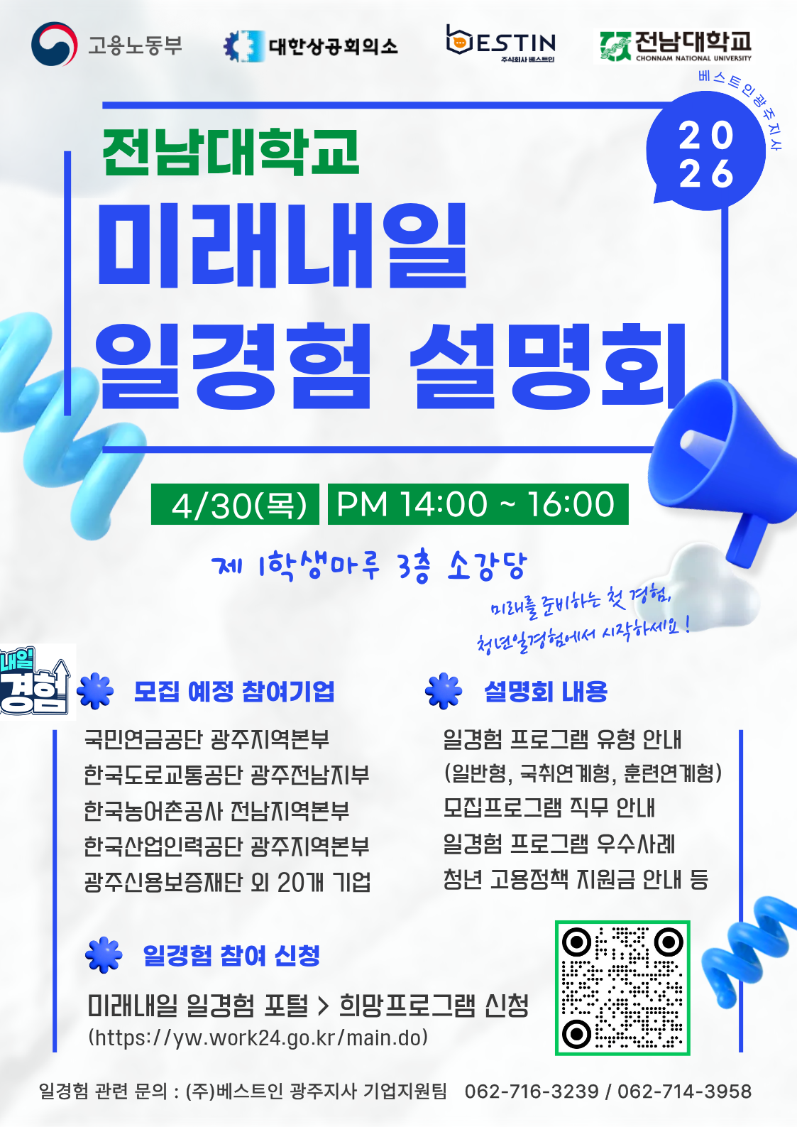 취업 준비에 실질적인 도움이 되는 공공기관 실무 경험 기회를 안내드립니다. 월 150만 원의 수당과 함께 직무 역량을 쌓을 수 있는 좋은 기회이니 경영학과 학생분들의 많은 참여 바랍니다.